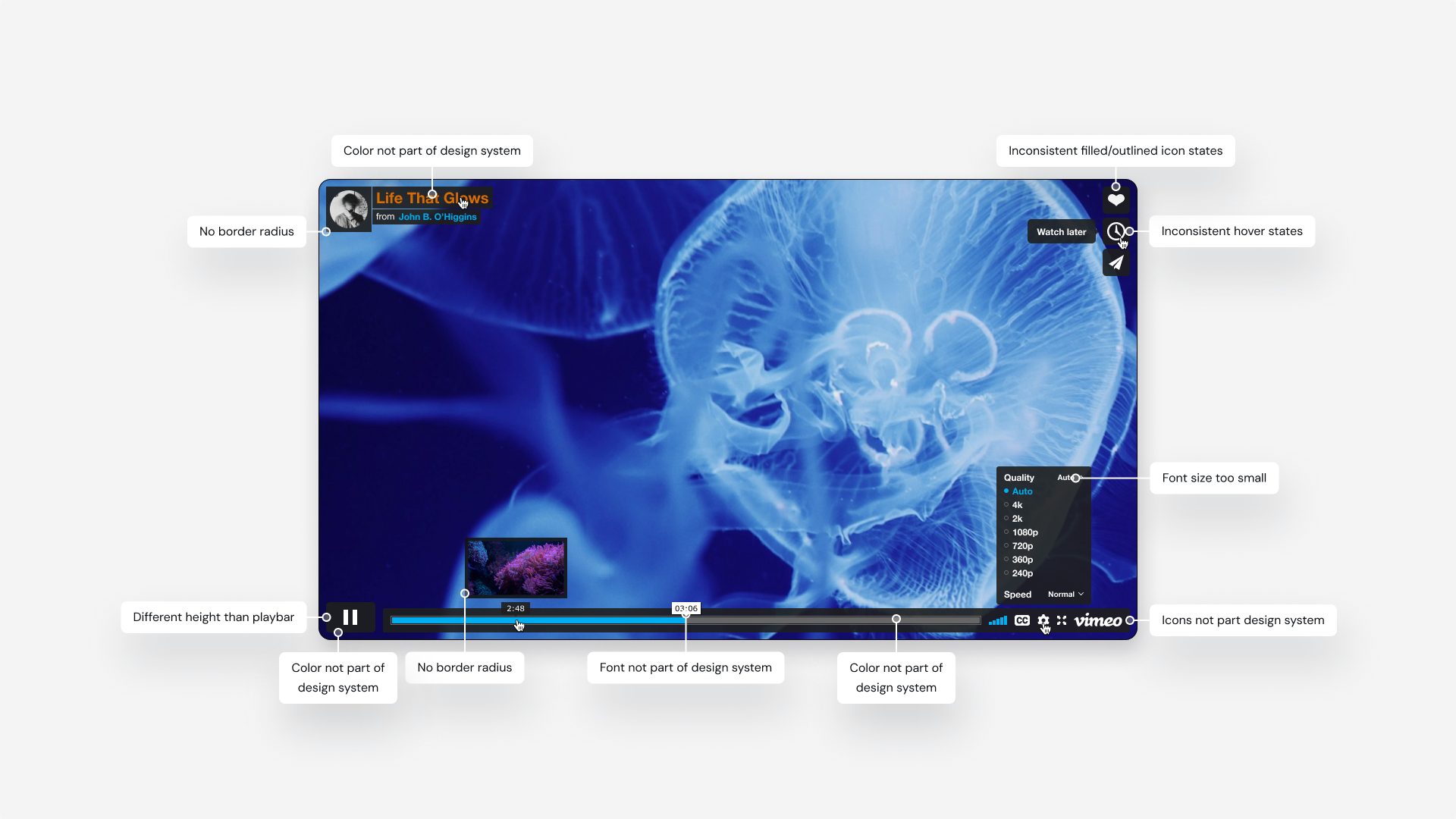 The team and I conducted a comprehensive accessibility audit, which gave us a clear roadmap of the gaps we needed to close. I surveyed Vimeo employees and users to find out what was and wasn’t working. On the design side, I conducted a deep-dive audit of the existing player and our design system, identifying every inconsistency. I created interactive prototypes to test usability with different users, ensuring our solutions were compliant and intuitive.