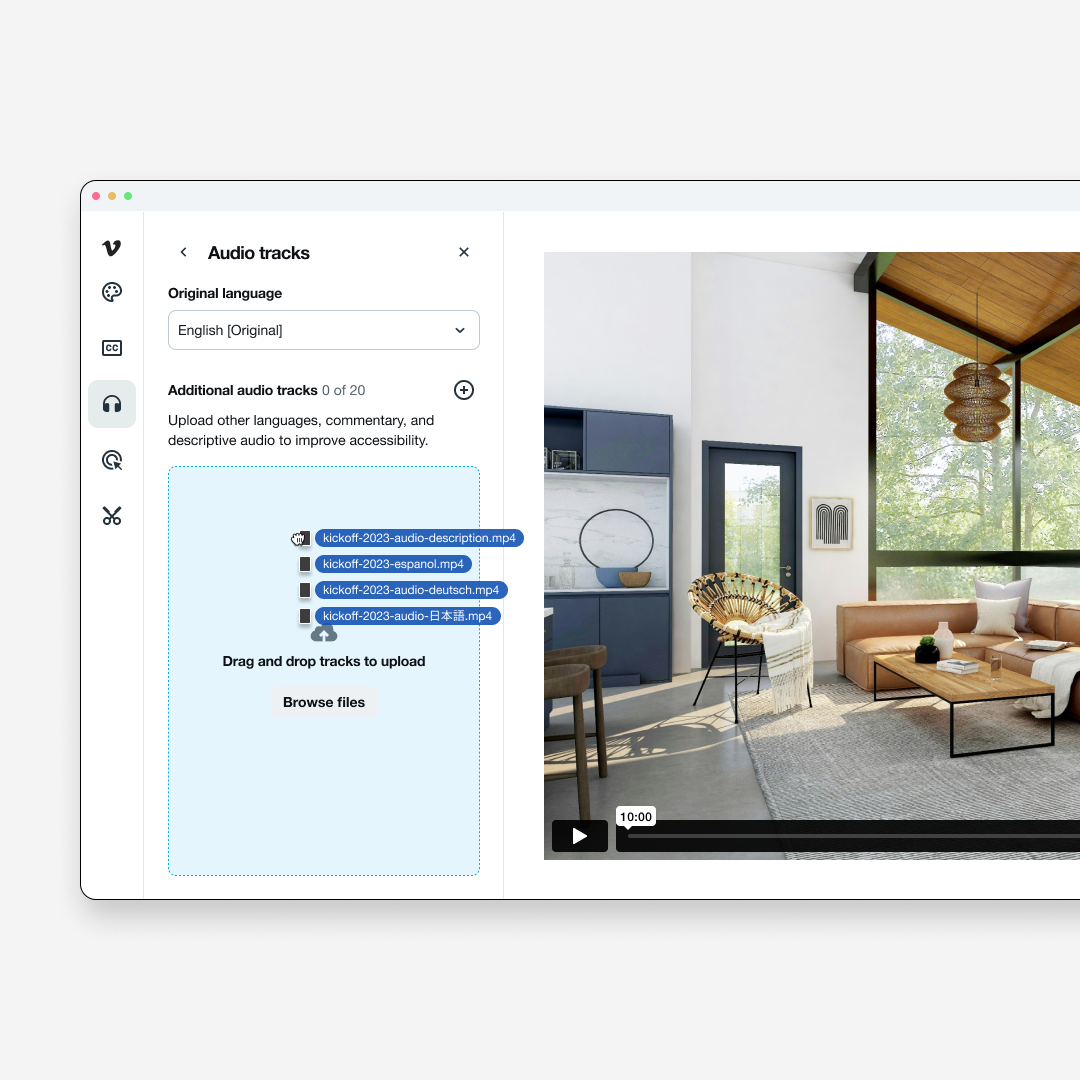 Creators can now drag and drop audio files directly into their video settings, with options to configure the language or type of audio track.